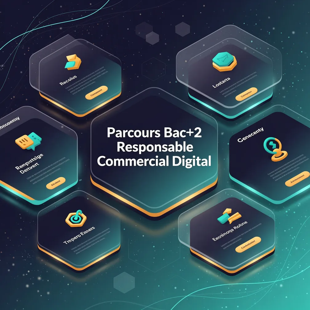 Formation complète bac+2: 150 heures en ligne + 100 heures en présentiel avec stages. Couvre management commercial, e-commerce, marketing digital, gestion projet, leadership. Diplôme officiel reconnu, accès emplois cadre (28-38k€), possibilité poursuite bac+3.